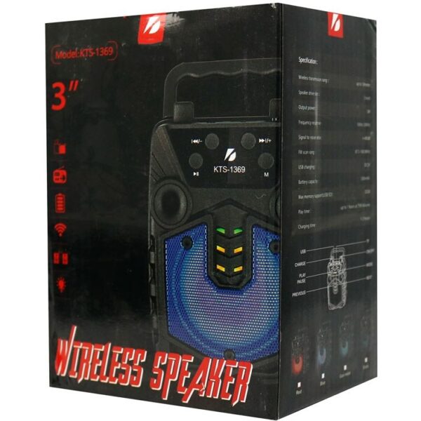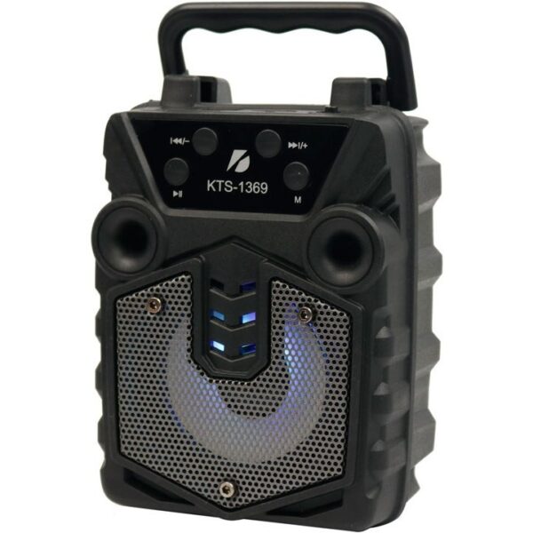 اسپیکر بلوتوثی کی تی اس مدل KTS1369 یک دستگاه صوتی قابل حمل و کاربردی است که با طراحی جمع و جور و وزن سبک، امکان پخش موسیقی با کیفیت بالا را در هر زمان و مکان فراهم می‌کند. این اسپیکر با بهره‌گیری از فناوری بلوتوث نسخه 5.0 اتصال پایدار و بی‌دردسر را به گوشی موبایل، تبلت یا لپ‌تاپ شما ارائه می‌دهد.